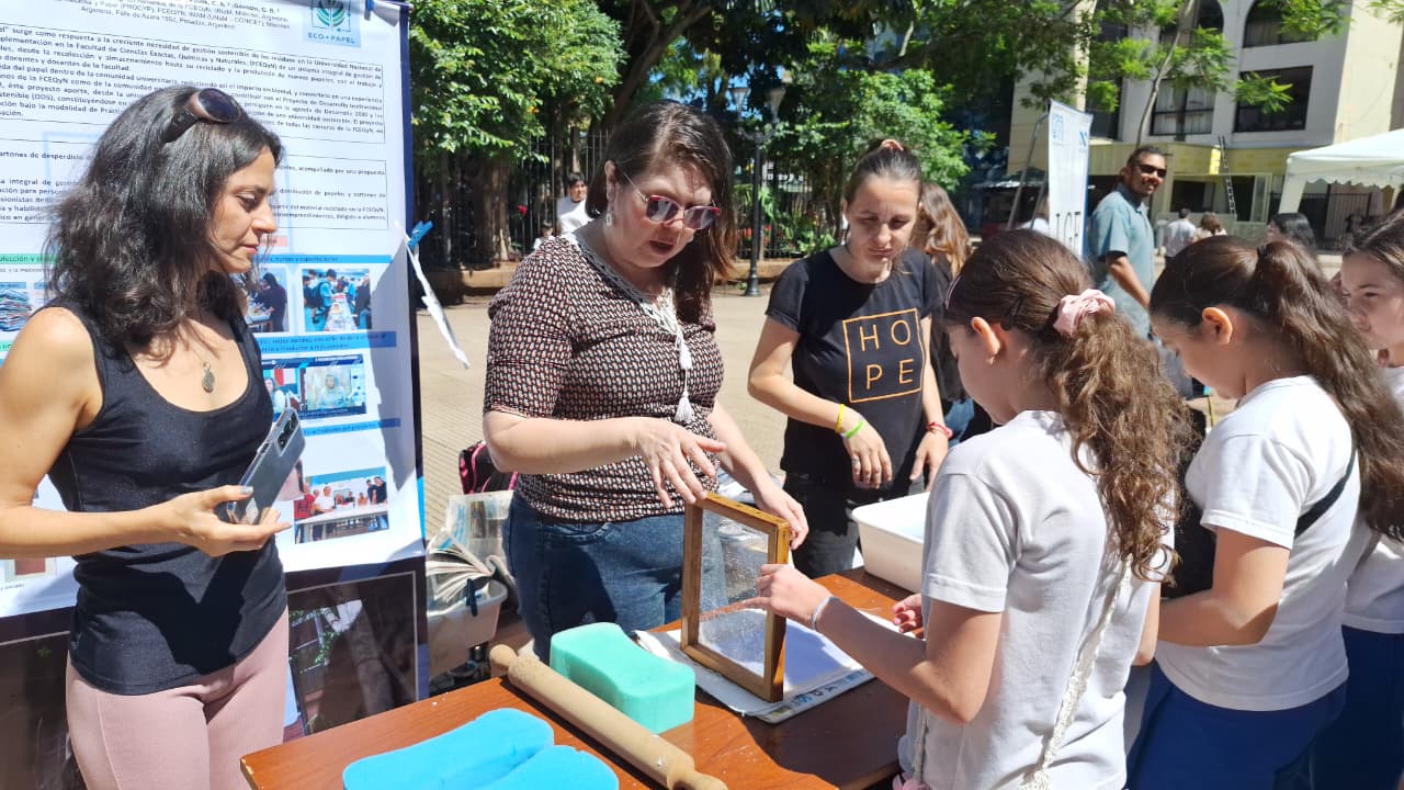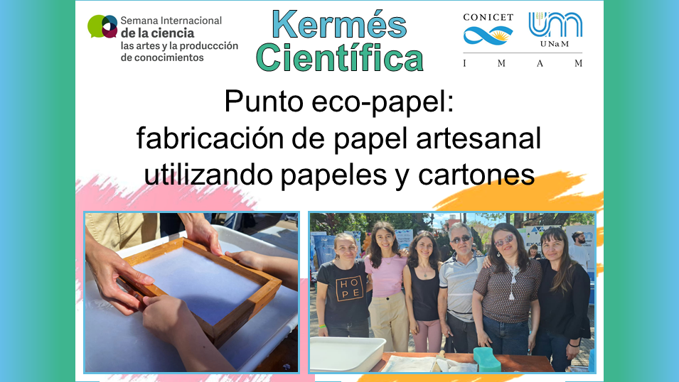 El Instituto de Materiales de Misiones (IMAM, CONICET-UNaM) participó el 18 de noviembre en la kermés científica organizada por la Universidad Nacional de Misiones, realizada en la Plaza 9 de Julio de la ciudad de Posadas. La actividad, enmarcada en la semana internacional de la ciencia, las artes y la producción de conocimientos, contó con la participación de varios grupos de investigación del IMAM. Una de las propuestas, perteneciente al Programa de Celulosa y Papel (PROCYP), fue "Punto Eco-Papel: fabricación de papeles artesanal utilizando papeles y cartones", donde se propuso fomentar la conciencia ambiental y la reutilización responsable de residuos mediante la enseñanza del proceso de fabricación de papel artesanal a partir de papeles y cartones usados.